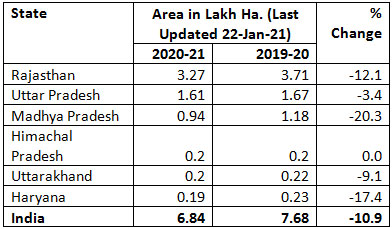 Barley, rabi (winter) crop is a small scale crop and is primarily a cereal grain popularly known as "Jau" in India. India grows 0.65-0.8 million hectares per annum of barley each year which produces around 1.5-1.8 million tonnes, with approximately 80 per cent used for feed and 20pc for the food market, including malting and brewing. In India, Rajasthan (50%), Uttar Pradesh (22%), Madhya Pradesh (15%), Haryana and Himachal Pradesh are the major producers of barley.